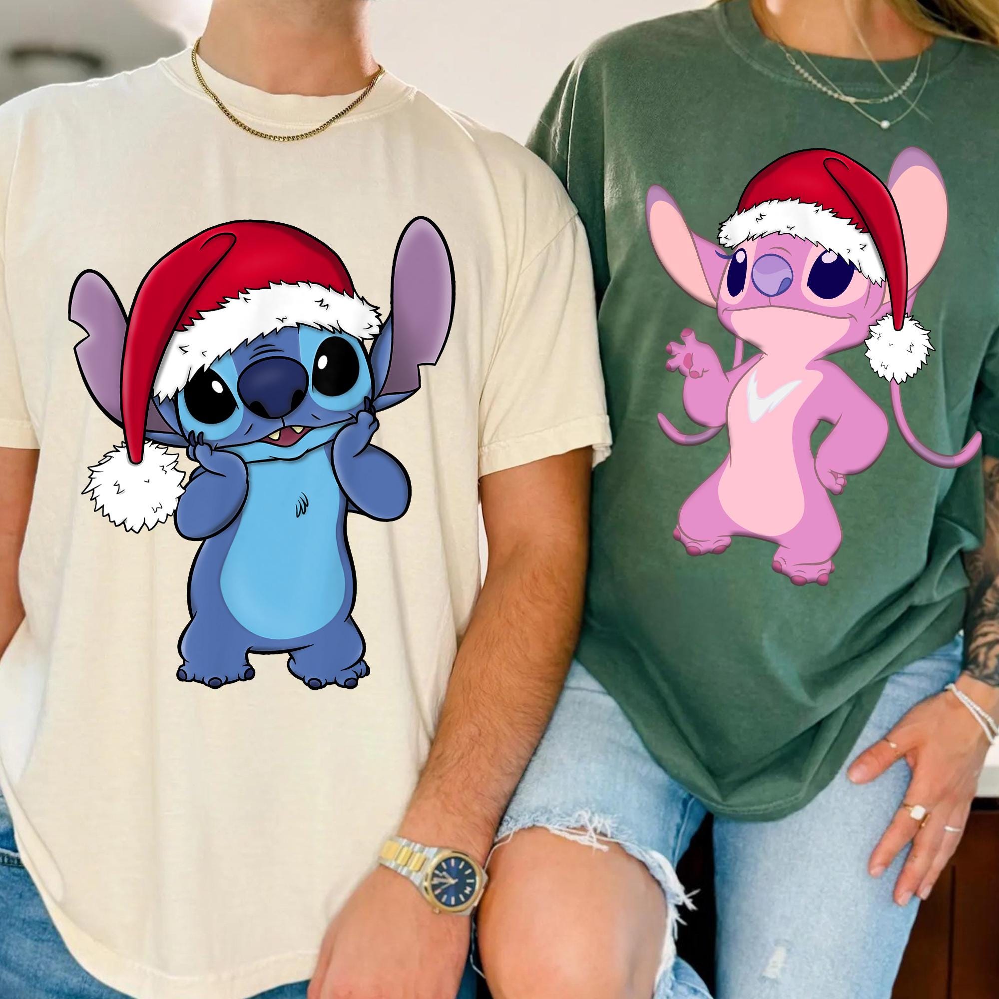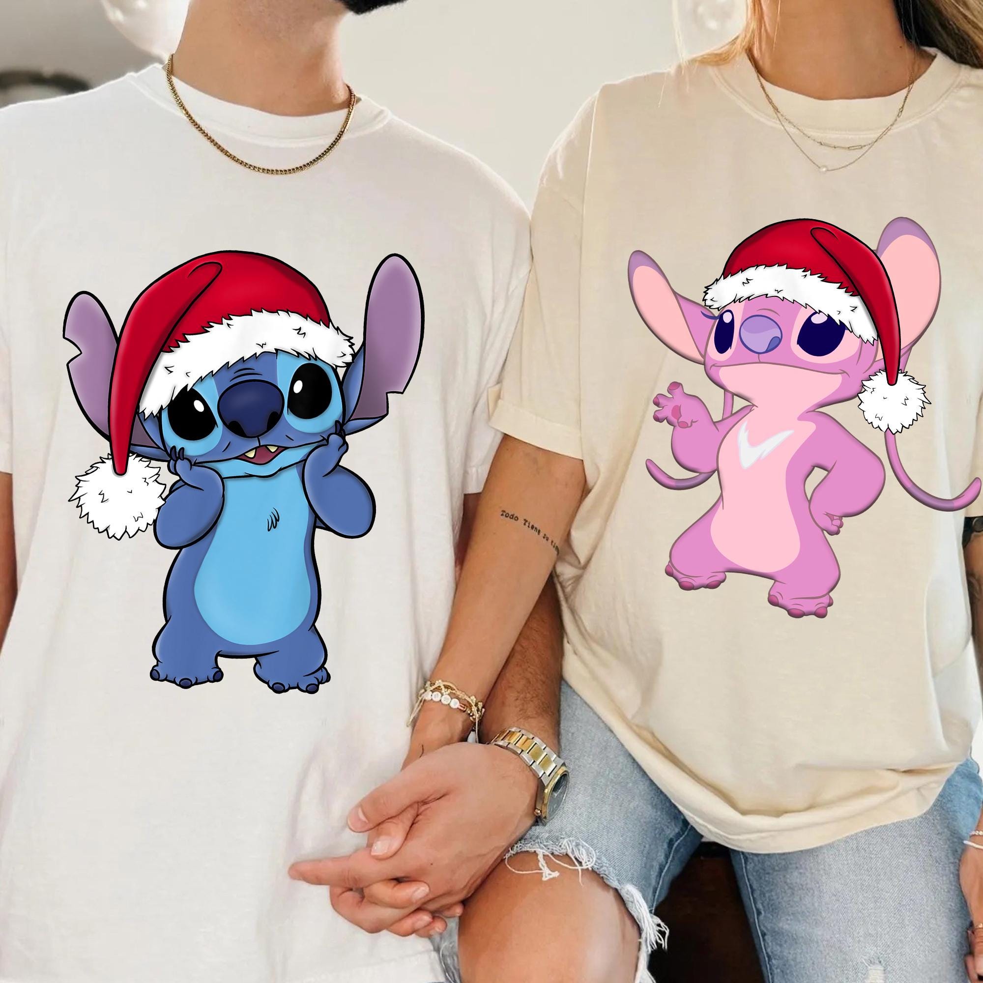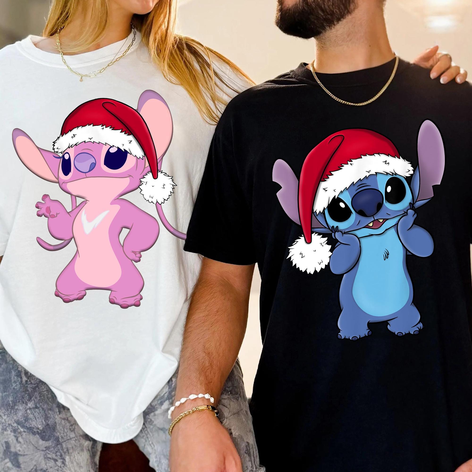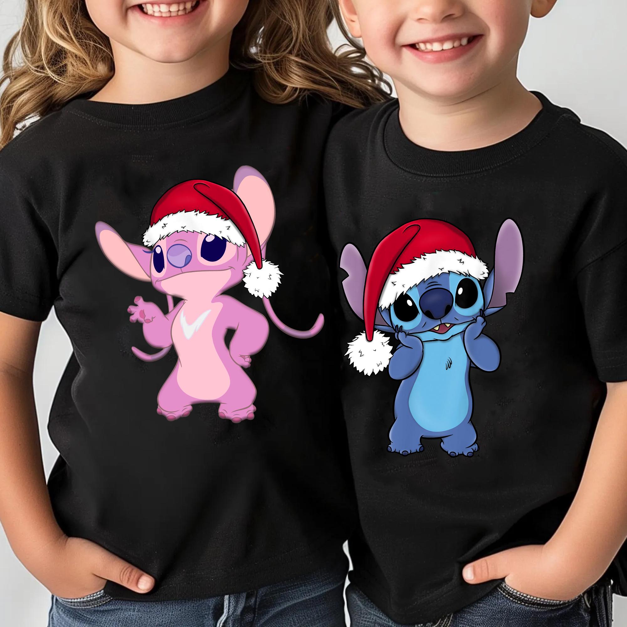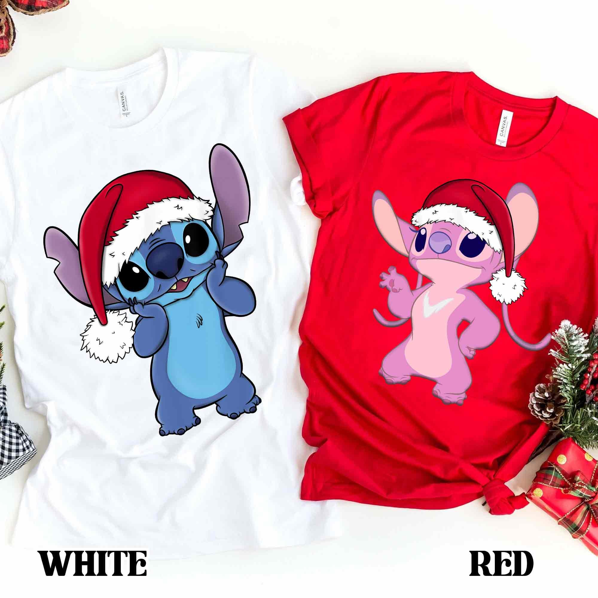 Santa Hat Stitch And Angel Portrait Christmas Couple Shirt, Lilo And Stitch Matching Xmas Tee, Disney Couple Holiday Trip Outfits