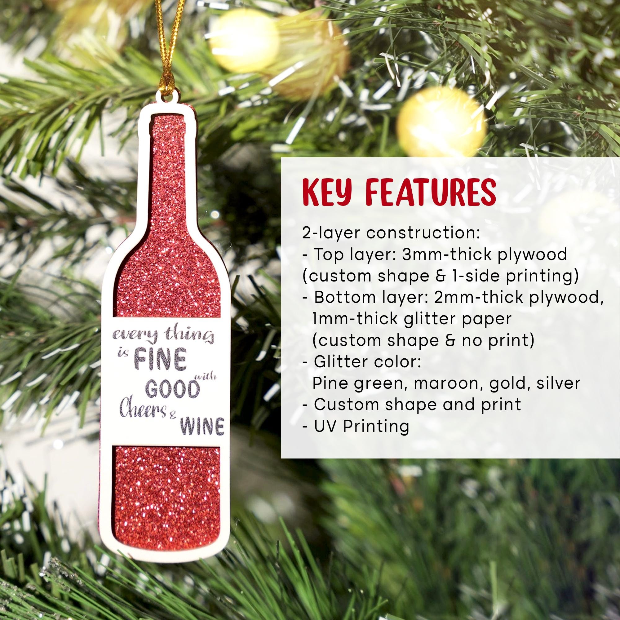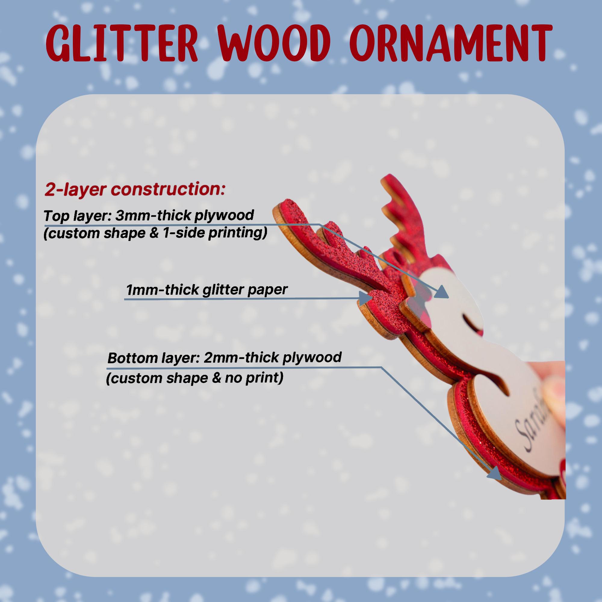 - Custom 2-layer wood ornament with UV-printed top & glitter base ✨