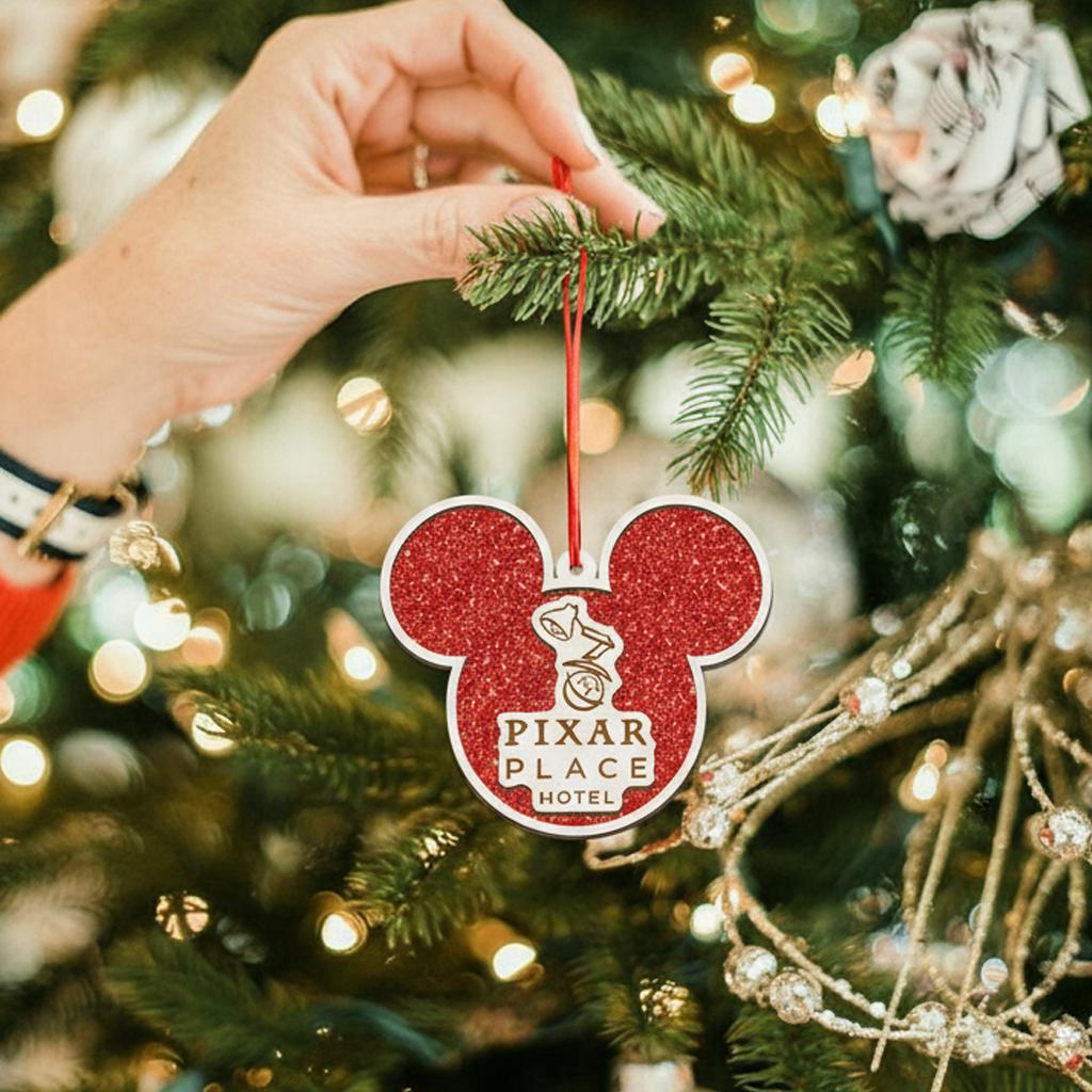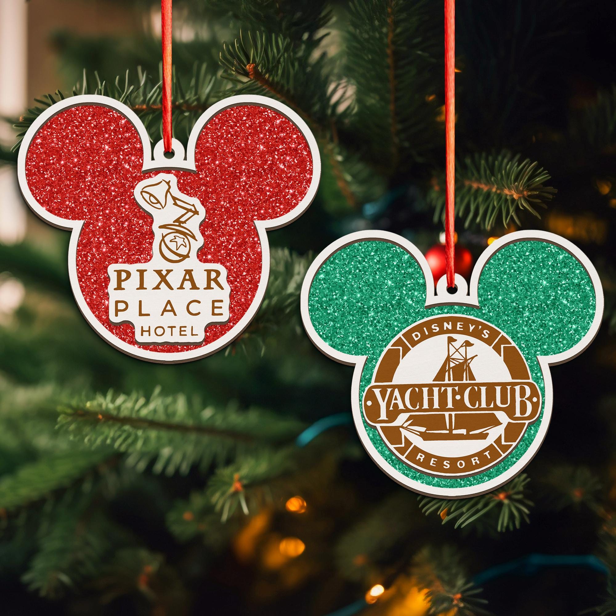 Add Disney resort magic to your tree with these glitter wood ornaments! Featuring Pixar Place Hotel and Yacht Club Resort designs inside a Mickey head — a stylish keepsake for Disney lovers and collectors.